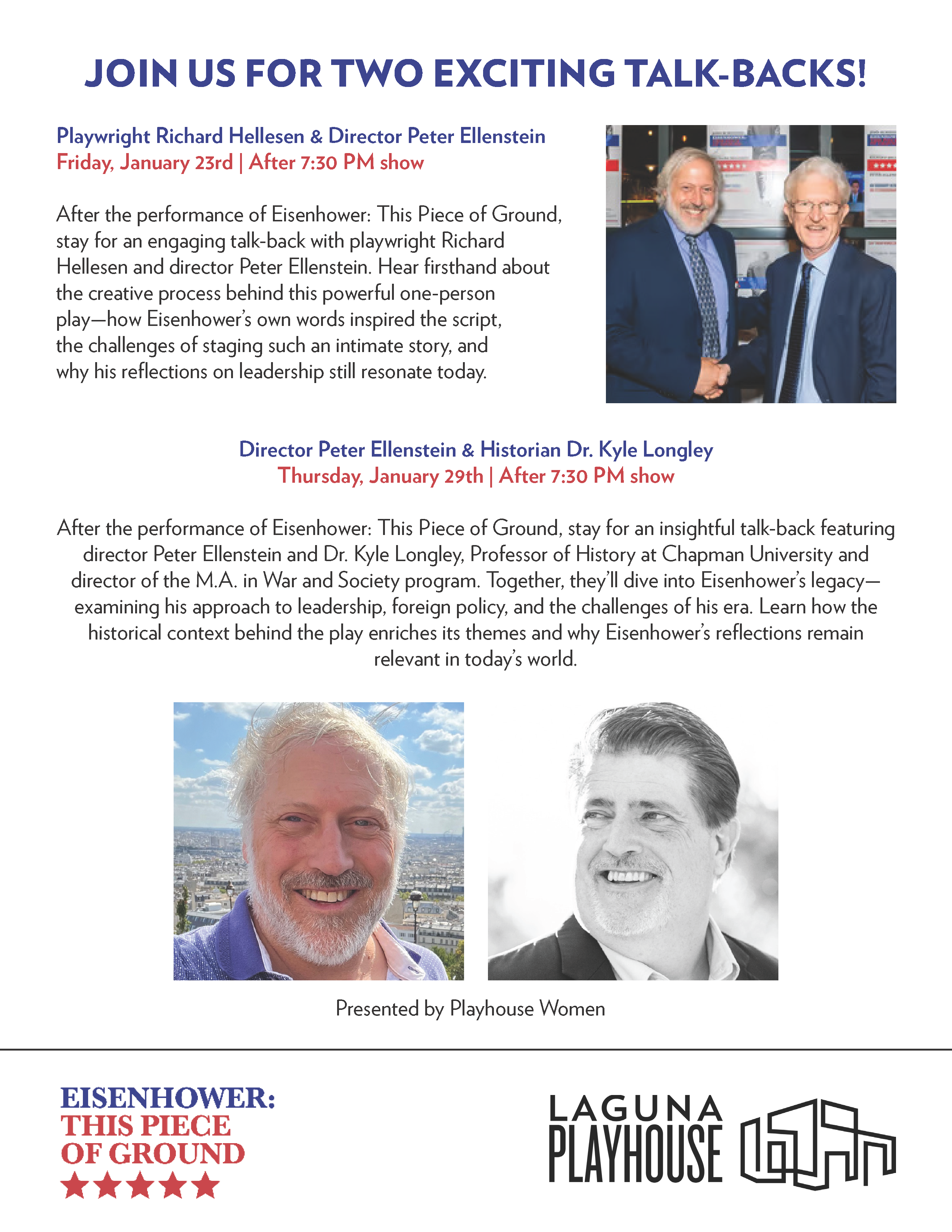 This groundbreaking solo performance by Tony Award winner, John Rubinstein, brings the 34th president, Dwight D. Eisenhower’s remarkable life to the stage in an extraordinary way. Through captivating storytelling and deep historical insight, the performance immerses audiences in Eisenhower’s personal reflections on leadership, war, and peace. With emotional depth and powerful nuance, it unpacks the complexities of a man who shaped the course of history during one of America’s most pivotal eras. A must-see theatrical experience! Run Time: Approximately 1 hour and 50 minutes with a 15 minute intermission.
